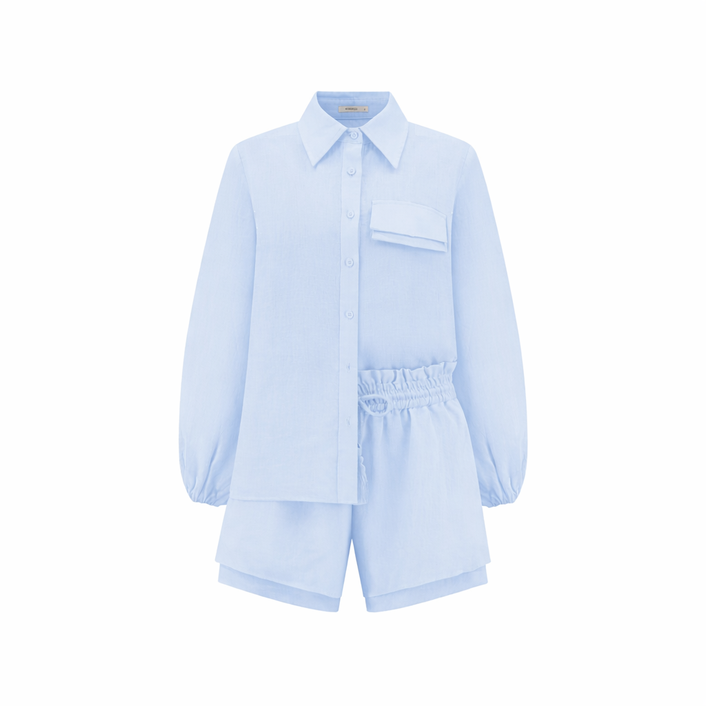 Cut from 100% premium linen in a soft light blue tone, this two-piece set pairs an oversized shirt with layered high-waist shorts. The elasticated waistband and tassel ties bring ease. The double hem adds quiet structure.