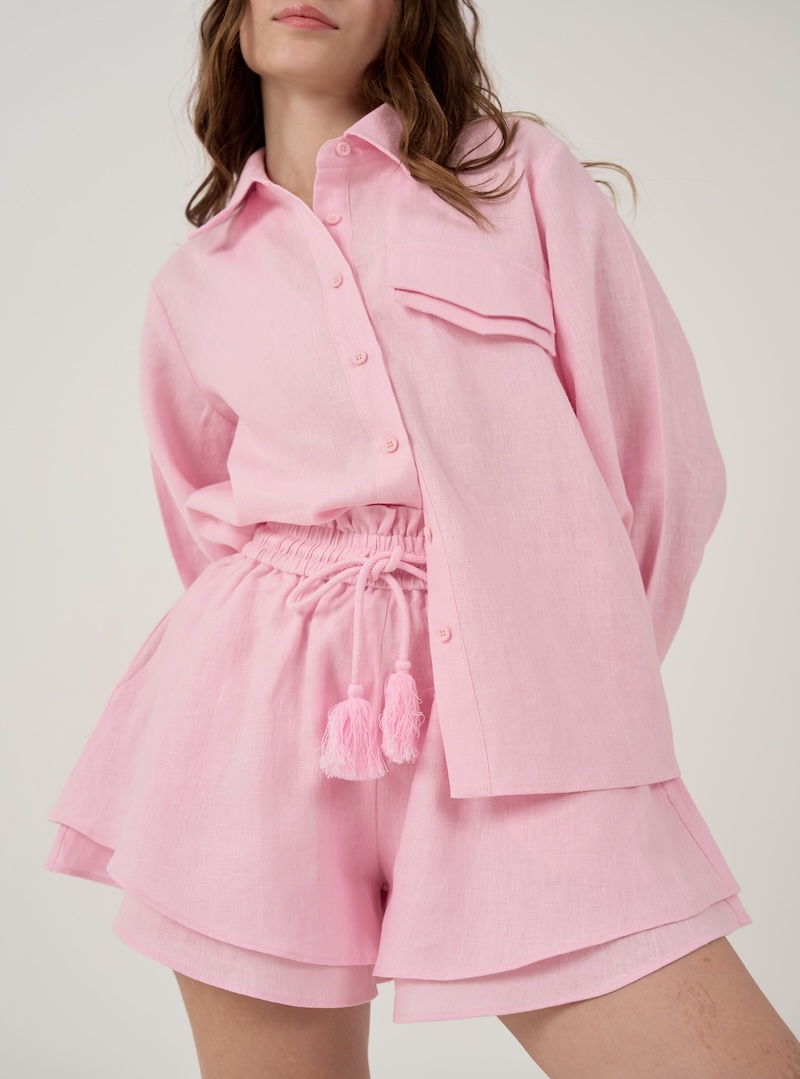 Cut from 100% premium linen in a soft blush pink tone, this two-piece set pairs an oversized shirt with layered high-waist shorts. The elasticated waistband and tassel ties bring ease. The double hem adds quiet structure.